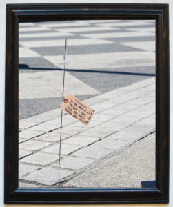 The materials used for past works include found wire, paper tags and mylar. Mylar is an integral material to the concept of the piece; as it reflects the surroundings, catches and moves the light and makes a very lovely sound when the wind blows. I imagine new versions of this project for public space using more substantial materials but with the same properties. I’m especially interested in emphasizing the many ways that the tags make shadows on the ground. Currently working on a a gallery version of this series that responds to site and/or reflects another site of meaning.